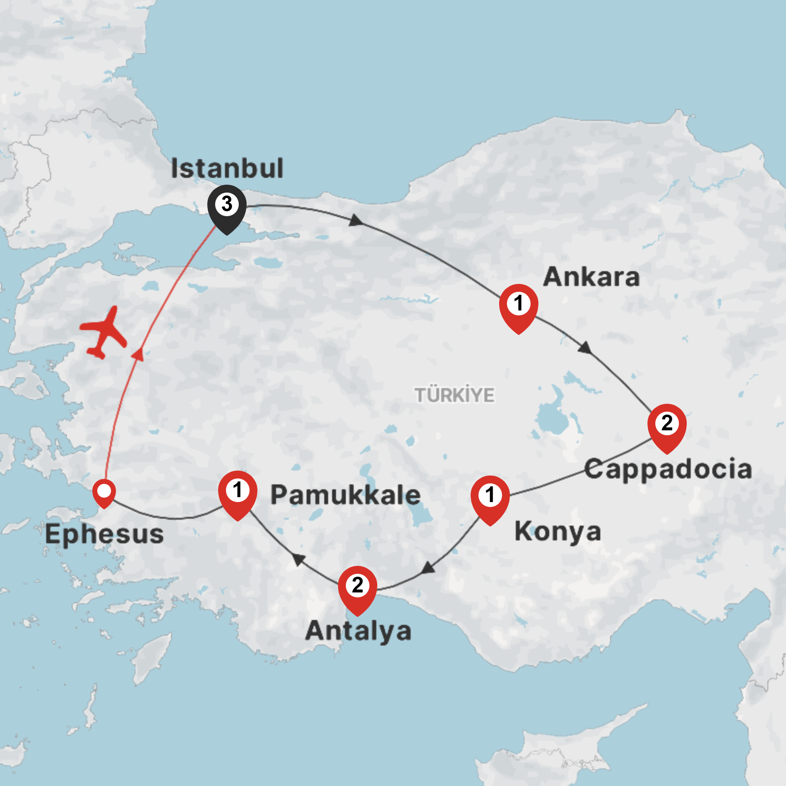 Begin your journey in the vibrant metropolis of Istanbul, where the echoes of empires past resonate through its bustling streets and iconic landmarks. Then, venture into the otherworldly landscapes of Cappadocia. Next, immerse yourself in the sun-drenched charm of Antalya, where turquoise waters and pristine beaches await. Continue your exploration as you marvel at the cascading travertine terraces of Pamukkale. Finally, delve into the ancient ruins of Ephesus, where the remnants of an illustrious past come to life amidst the ruins of this once-great city.